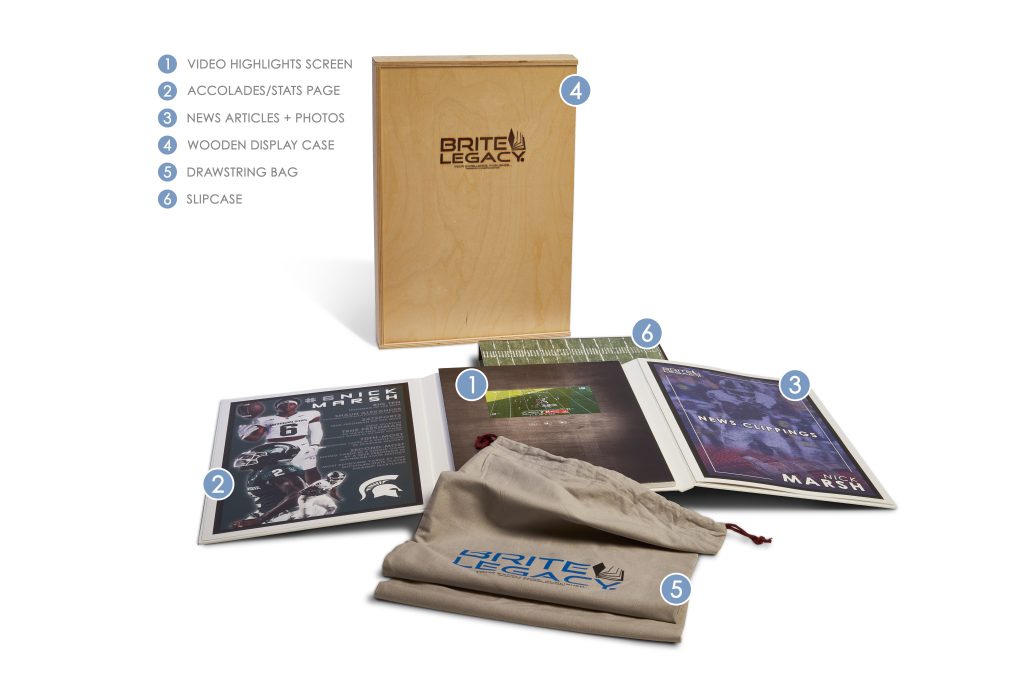 As seen on home page video, it's a trifold memorabilia piece containing four parts. Photo mosaic cover. Accolades/Stats page. Video highlights screen. Six pages of articles with photo mosaic on the front cover. Cover material is ultra high quality immitation leather.